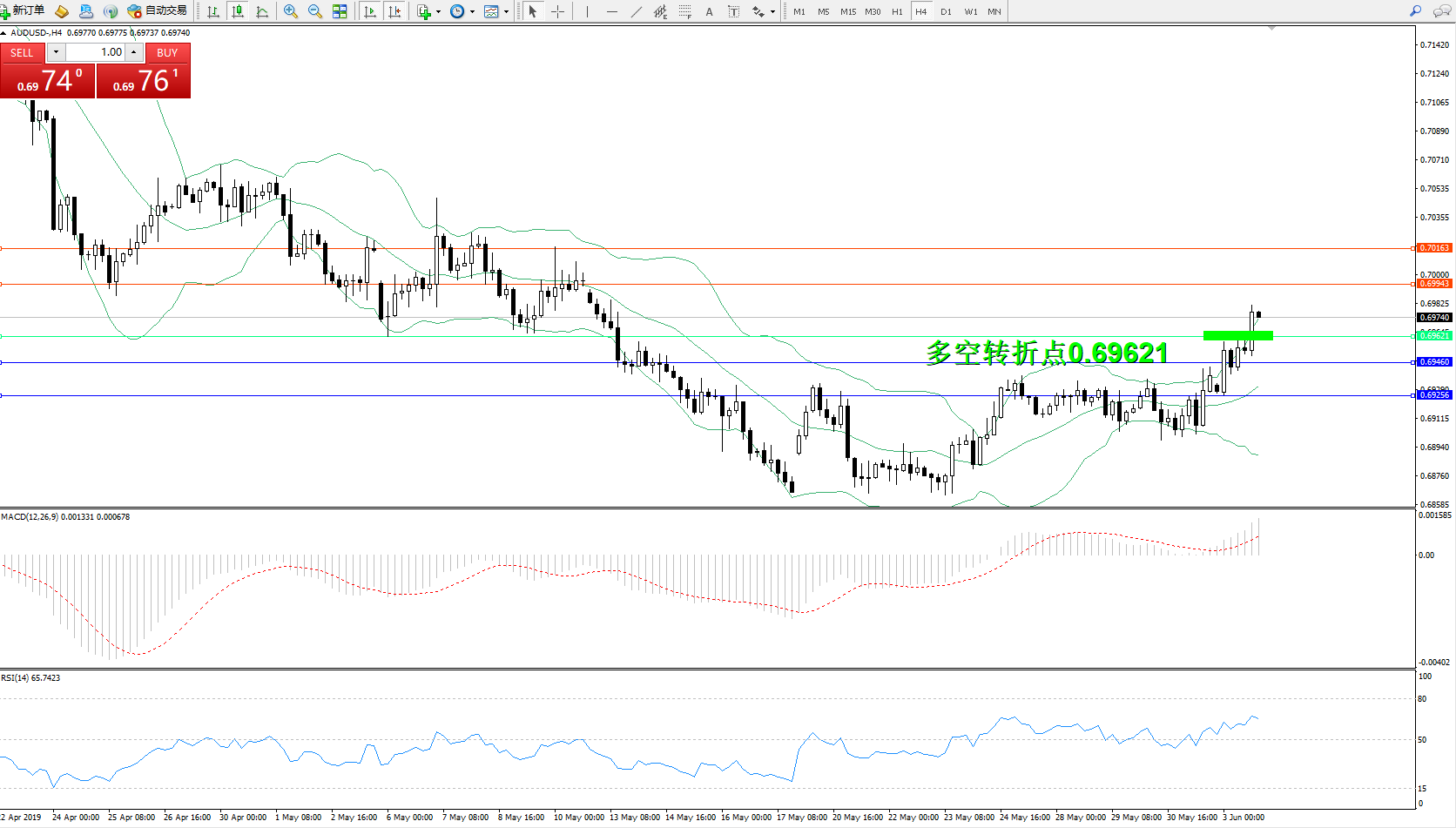 交易策略:0.69621上方看涨,目标0.69943、0.70163