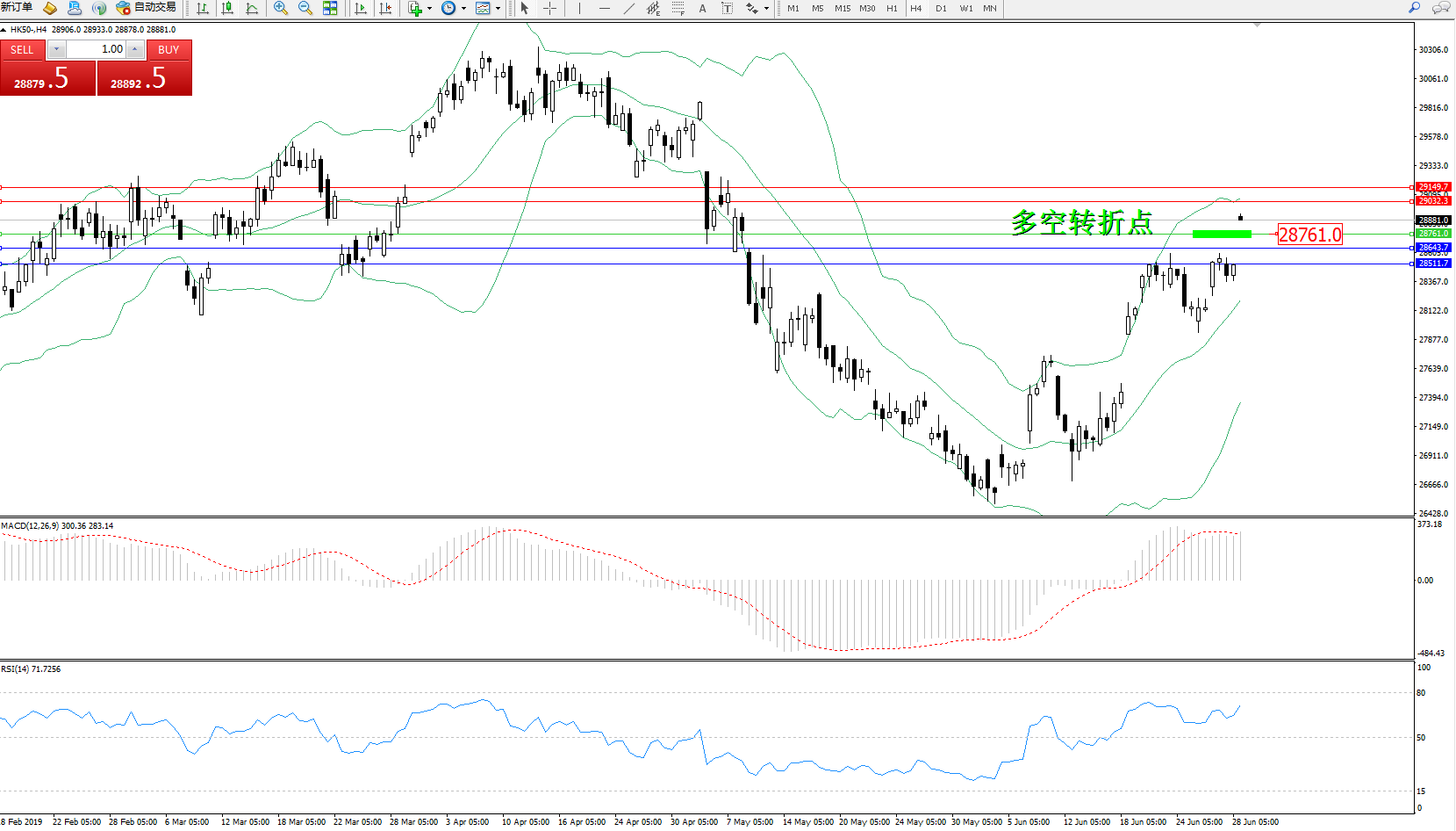 交易策略:28761上方看涨,目标29032、29149