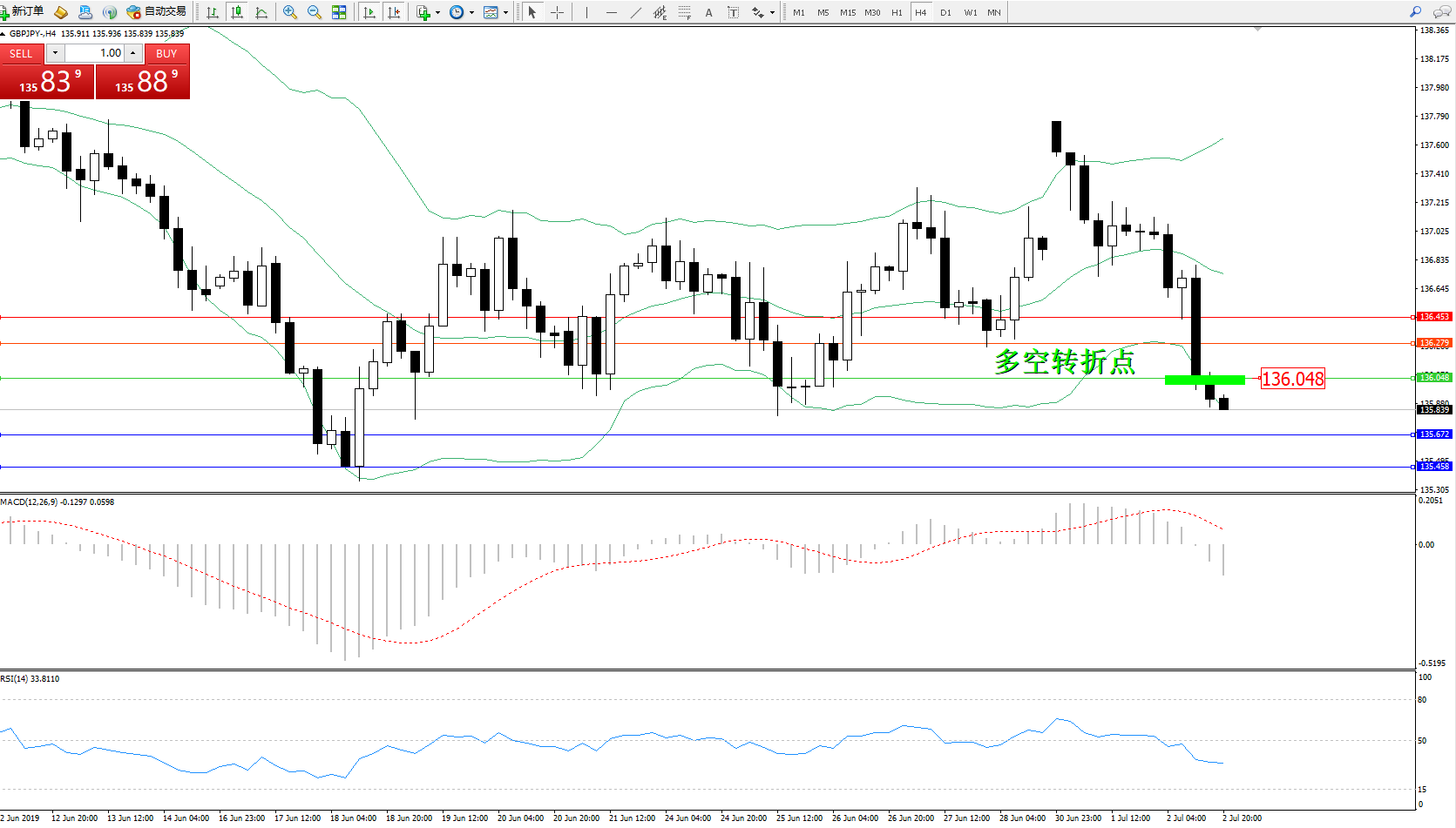 交易策略:136.048下方看跌,目标 135.672、135.458