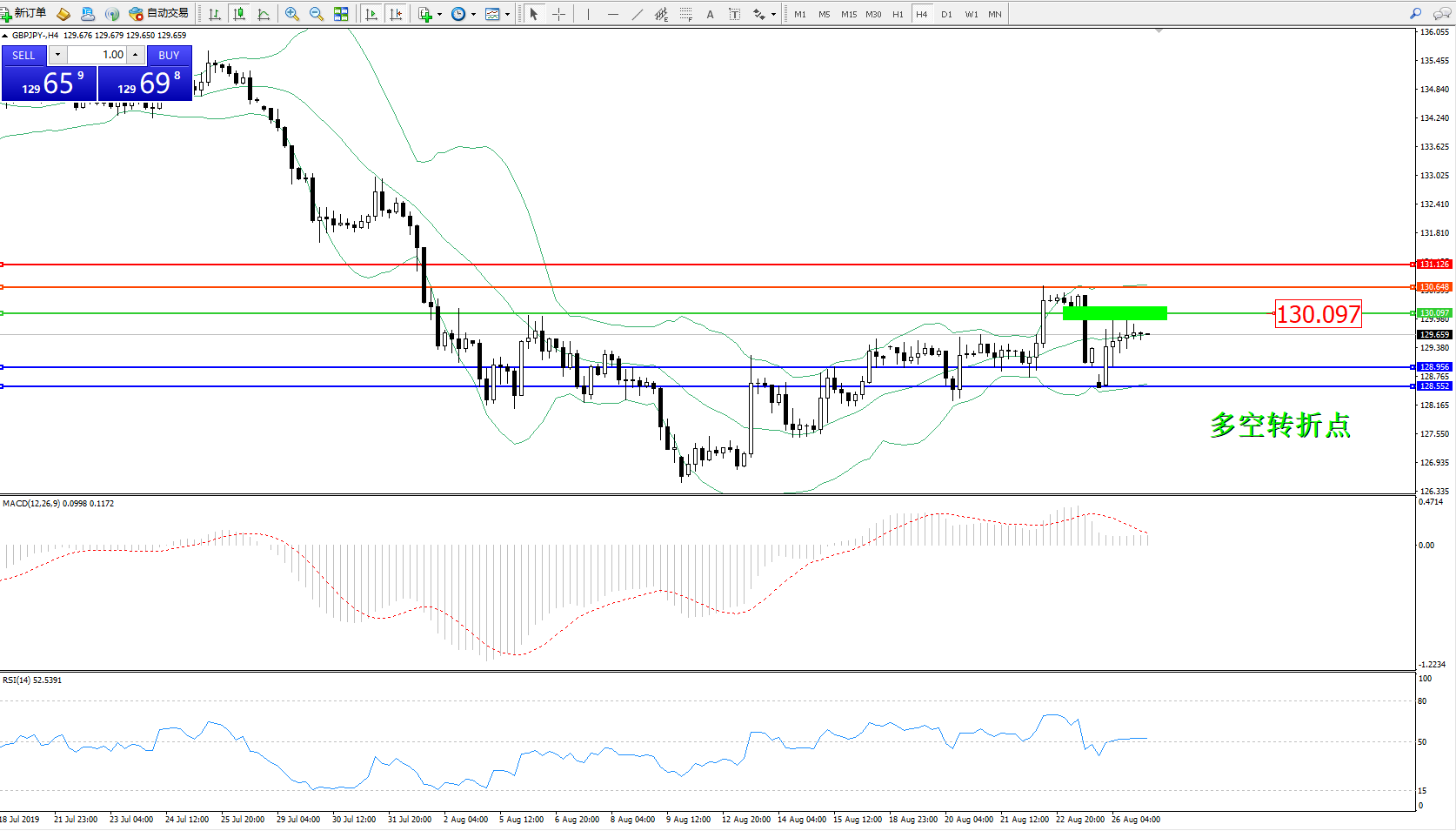 交易策略:130.097下方看跌,目标128.956、128.552