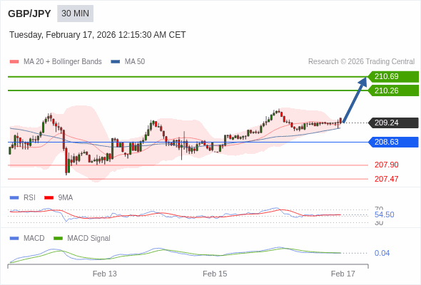 英镑/日元 当日内 : 看涨,当 208.63 为支撑位,目标定在210.69。