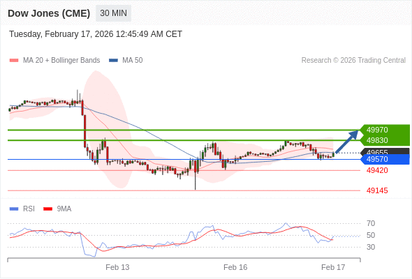 在 49570 之上,看涨,目标价位为 49830 ,然后为 49970 。