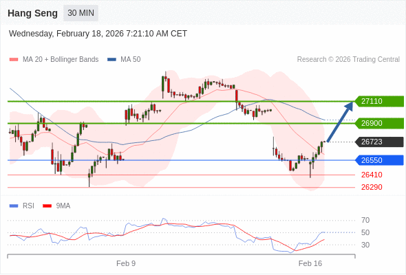 恒生指数 当日内: 在26550之上,看涨。