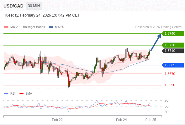 在 1.3685 之上,看涨,目标价位为 1.3720 ,然后为 1.3740 。