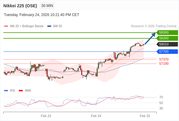 在 57700 之上,看涨,目标价位为 58260 ,然后为 58500 。
