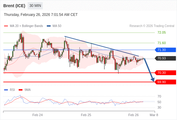 交易策略: 在 71.30 之下,看跌,目标价位为 70.30 ,然后为 69.90 。
