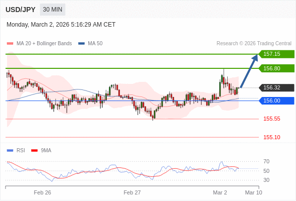 在 156.00 之上,看涨,目标价位为 156.80 ,然后为 157.15 。
