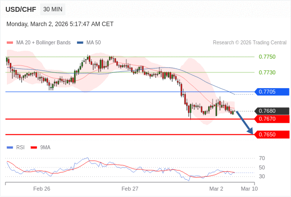 美元/瑞郎 当日内: 目标为0.7670。