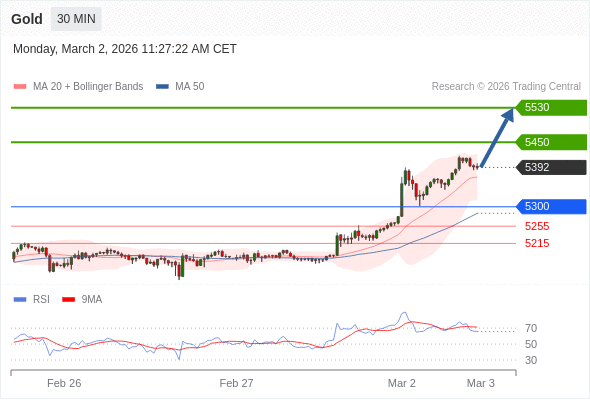 交易策略: 在 5300 之上,看涨,目标价位为 5450 ,然后为 5530 。