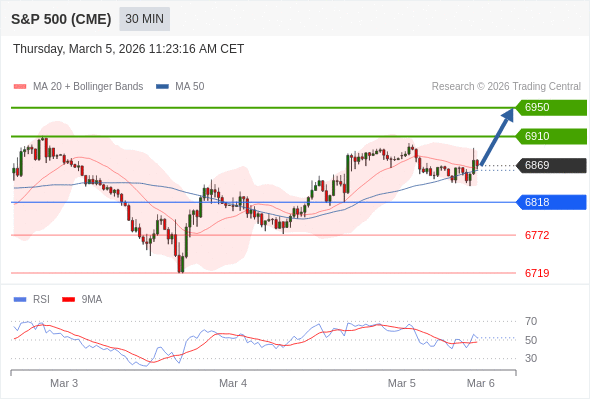 美国标普500指数期货 (H6) 当日内: 在6818之上,看涨。