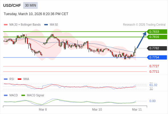 美元/瑞郎 当日内 : 看涨,当 0.7754 为支撑位。