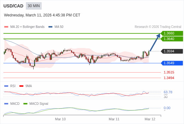 美元/加元 当日内 : 看涨,当 1.3549 为支撑位。