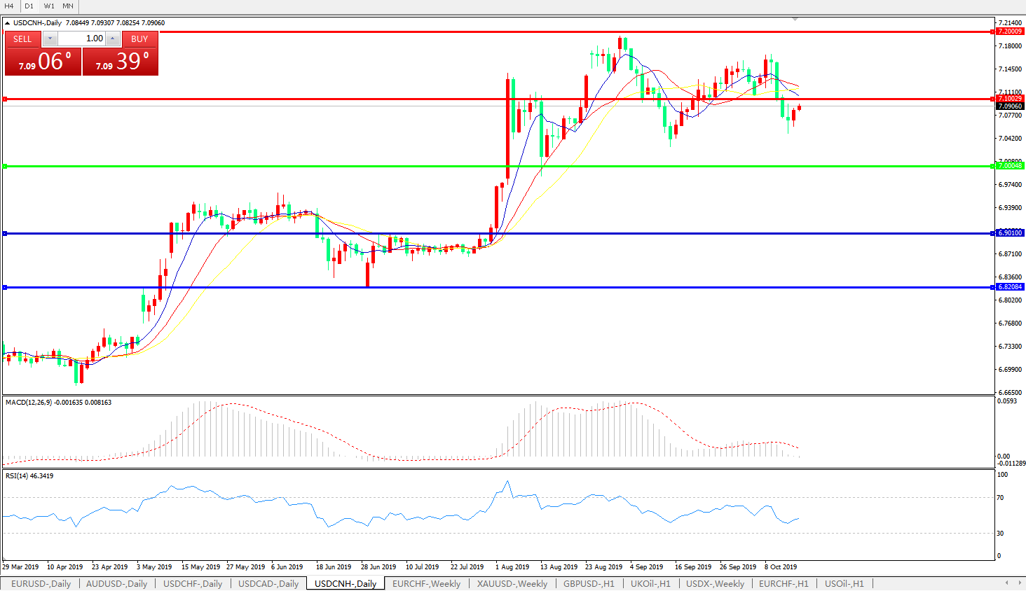 技术面简析:日图短期均线呈空头排列,汇价继续上行逼近7.10压制关口,MACD快速逼近0轴且量能快速缩量,RSI小幅走升,预计短期汇价将延续宽幅整理态势,汇价运行于7.00-7.10区间的概率较大;中美贸易后续谈判进展将决定汇价最终趋势。