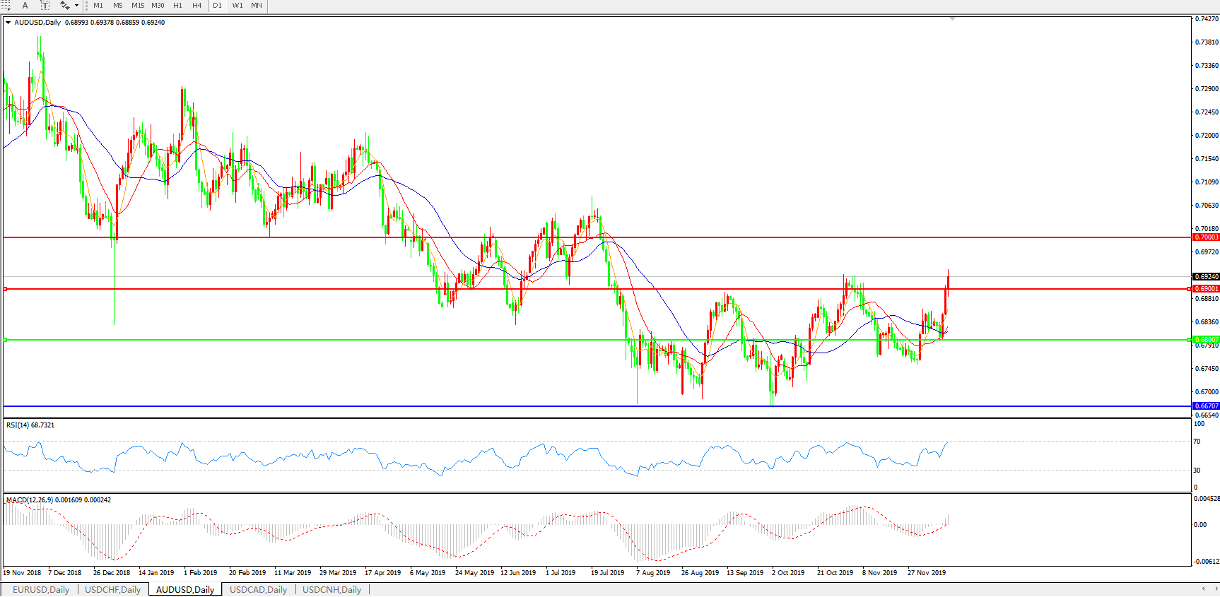 交易策略:0.6800上方看涨,目标0.6900、0.7000