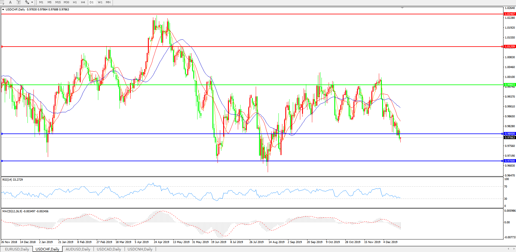 技术面简析:日线图均线呈有序空头排列,汇价延续弱势跌破0.98关口,MACD运行于0轴下方且量能0轴下持续放量,RSI持续震荡走低,预计汇价存进一步下行空间。