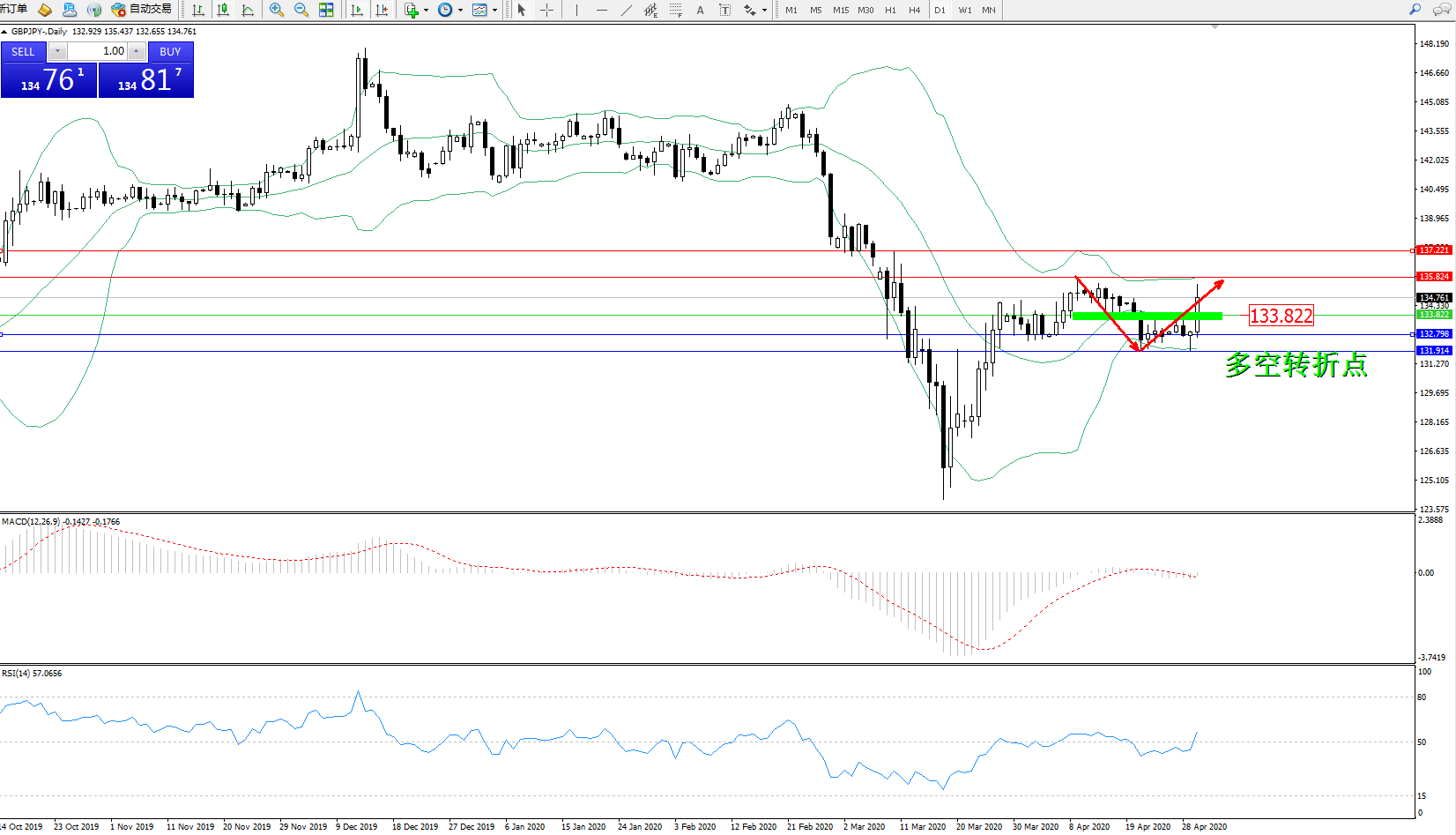 交易策略:133.822上方看涨,目标135.824137.221
