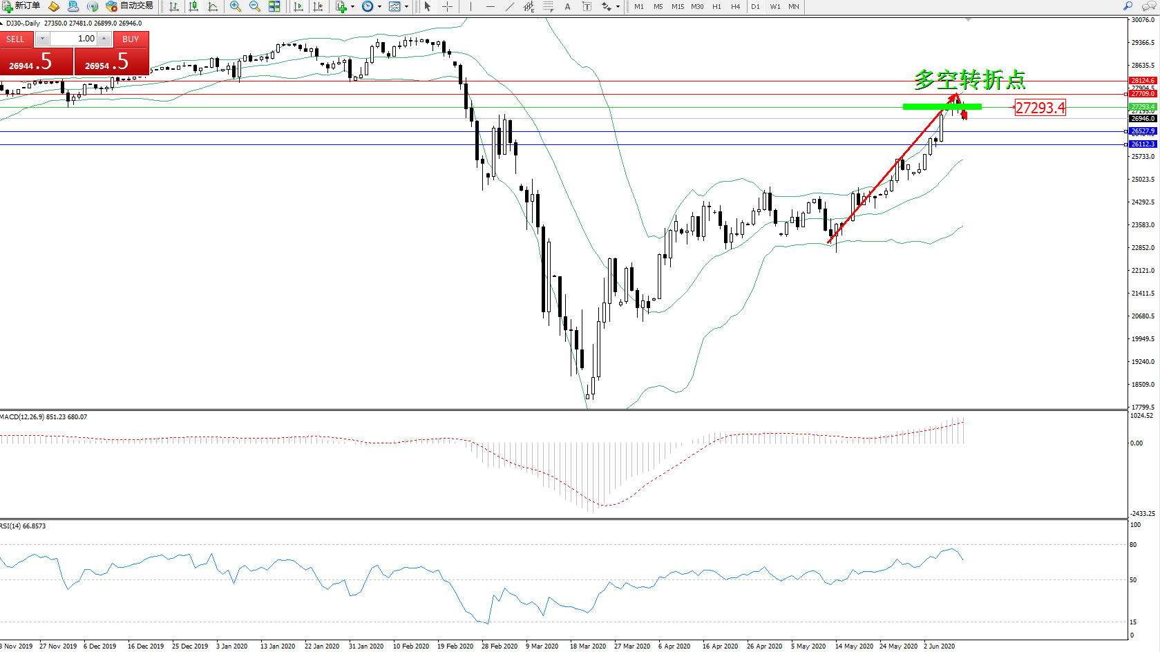 道琼斯指数610日(周三)收盘下跌282.30点,跌幅1.04%,报26989.99点。美联储决策者预计利率政策将保持不变到2022年;美联储声明发表后,美联储主席鲍威尔暗示新冠病毒疫情可能给美国经济造成永久性伤害。美国股市自3月份触及的低点已经上涨逾40%,美联储的空前刺激措施提振风险偏好。在美联储没有推出任何新措施之后,投资者似乎在获利了结,目前不宜承担风险。美联储周三重申了将继续为经济提供非常规支出的承诺,同时政策制定者预计今年国内生产总值(GDP)将萎缩6.5%,年底失业率将达到9.3%