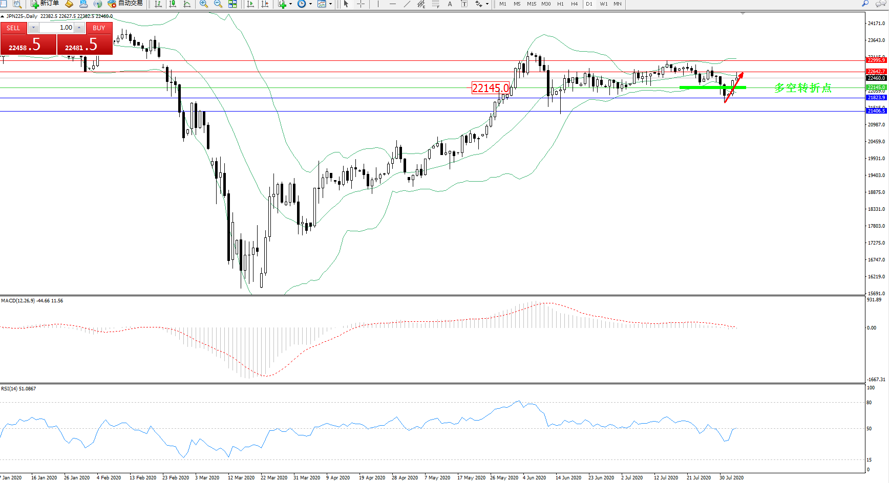 日经225指数8月4日(周二)收盘上涨377.62点,涨幅1.70%,报22573.00点。日本央行行长黑田东彦则表示将予以企业界更多支持。投资者非常担心全球前景,全球金融市场环境仍然宽松,市场波动程度已经减轻,股市债市录得全面上涨,后市或再度随着全球投资者对疫情消息的解读咀嚼而重返此前的盘整区间。市场对美联储进一步放宽货币政策的预期;美国国会议员对进一步财政刺激尚未达成一致;以及美国公债收益率下跌。因美元筑底行情仍在延续,近日美国疫情稍有缓和的消息阻息了美元指数继续下行,在美国ADP就业数据于周三公布之前,预计美元的超跌反弹趋势还会延续.