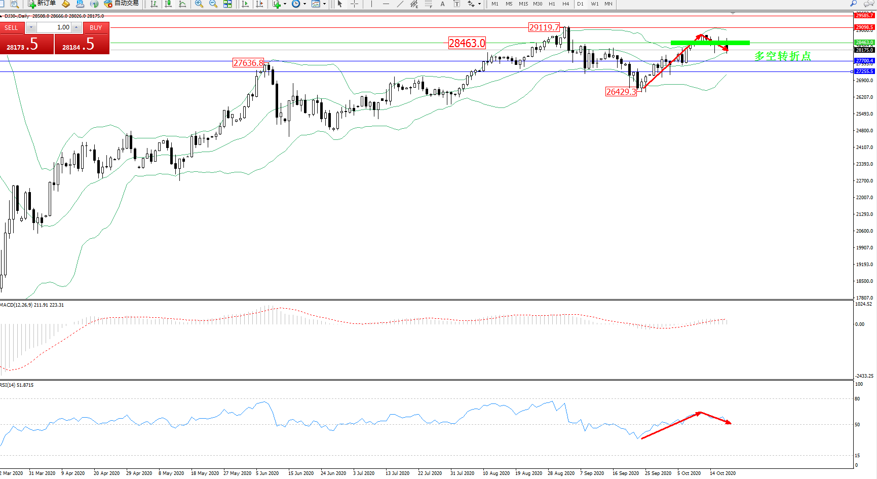 道琼斯指数10月19日(周一)收盘下跌410.90点,跌幅1.44%,报28195.42点。据美国当地媒体报道,在美国疾控中心(CDC)和食品药品管理局(FDA)对于新冠疫情的回应都曝出有政治干预嫌疑的众多报道之后,美国政府问责局表示已接受民主党参议员马萨诸塞州的伊丽莎白·沃伦,华盛顿州的帕蒂·默里和密歇根州的加里·彼得斯的提案,审查美国疾病控制与预防中心和食品药品管理局的科学诚信和沟通政策是否受到违规干预,以及“这些政策是否按照确保整个机构科学诚信的意图被执行。”美国白宫办公厅主任梅多斯表示,可以在48小时内就救助达成有希望的协议,也令市场不确定性下降,投资者的焦点将是美国大选。
