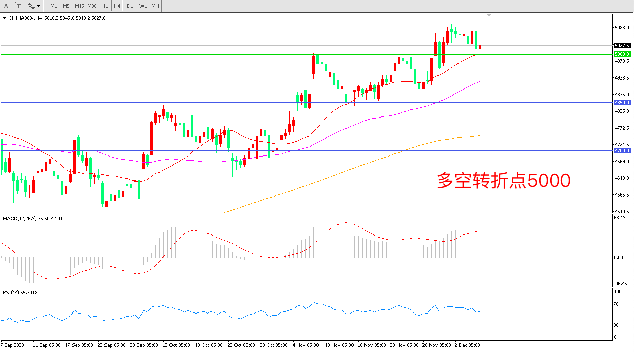 4小时图看,沪深300延续高位震荡,短期走势仍然坚挺,均线系统依然呈多头排列5000成为下方支撑MACD红柱增加,RSI指标走平,日内延续震荡概率较大。