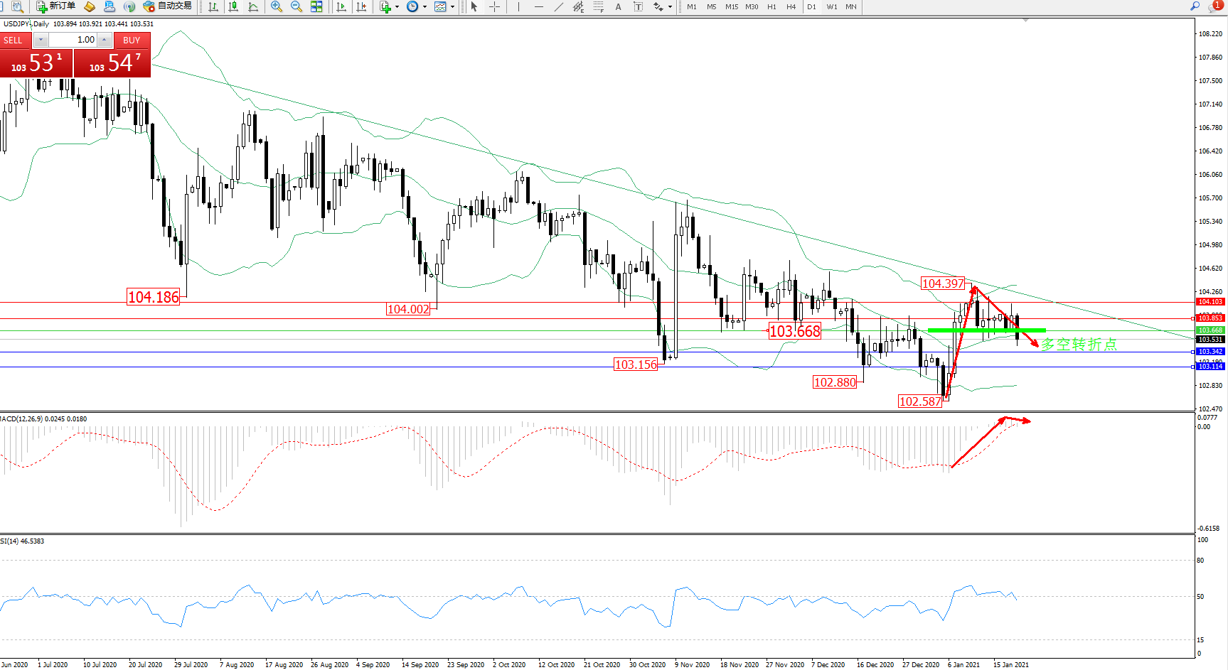 备选策略:103.668上方看涨,目标103.853、104.103