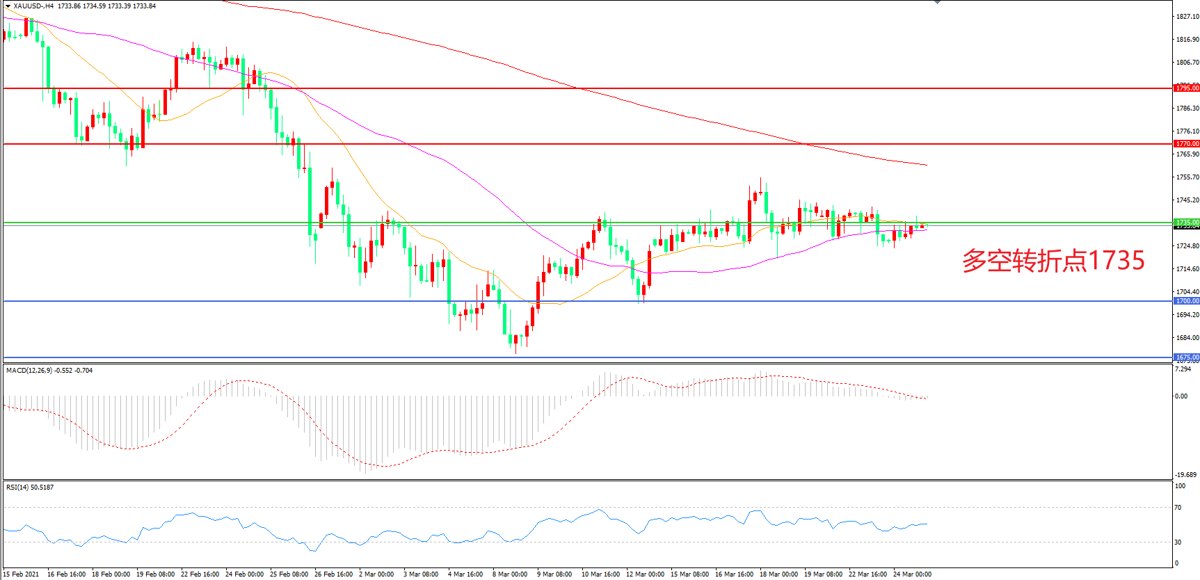 周三(3月24日),各国重新实施防疫封锁,增强了人们对美国经济引领全球复苏的信心,美元指数震荡上行,升至四个月高位,但欧洲疫情导致的避险买盘也令金价得到了一定支撑,现货黄金延续窄幅震荡走势,收报1734.12美元/盎司。美国耐用品订单出现接近一年以来首次下滑,令人失望的数据表现提振了黄金作为避险资产的吸引力。