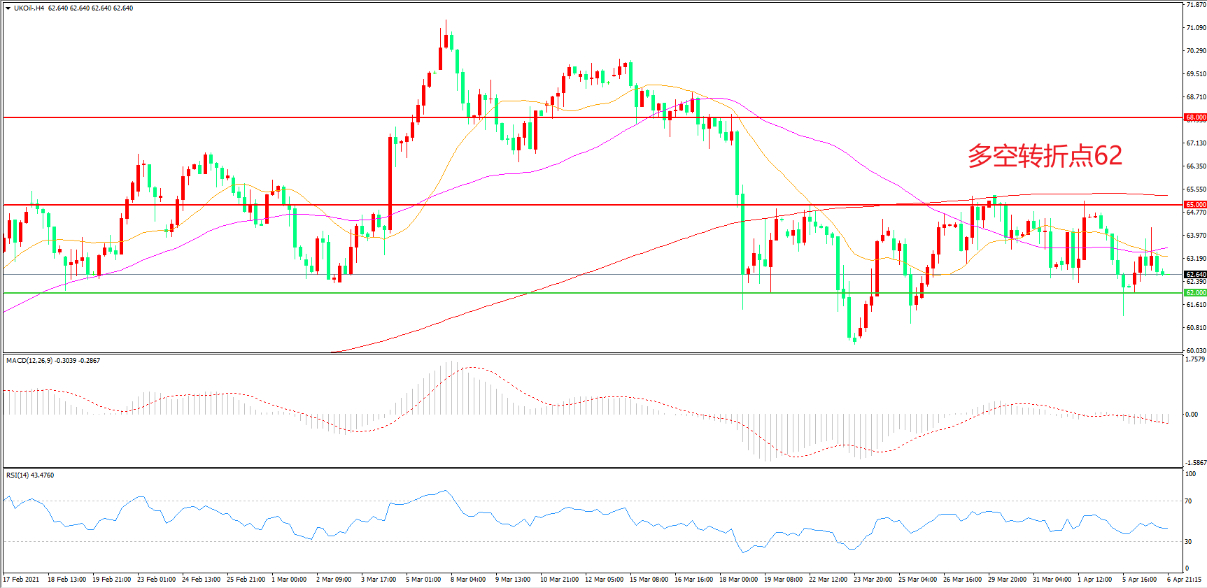 4小时图看,油价高点逐渐降低,下行趋势较为明显,整体表现低迷,均线系统粘合形成上方阻力,62美元成为短期多空分水岭,MACD绿柱增加,RSI指标走平,日内震荡下行概率较大。