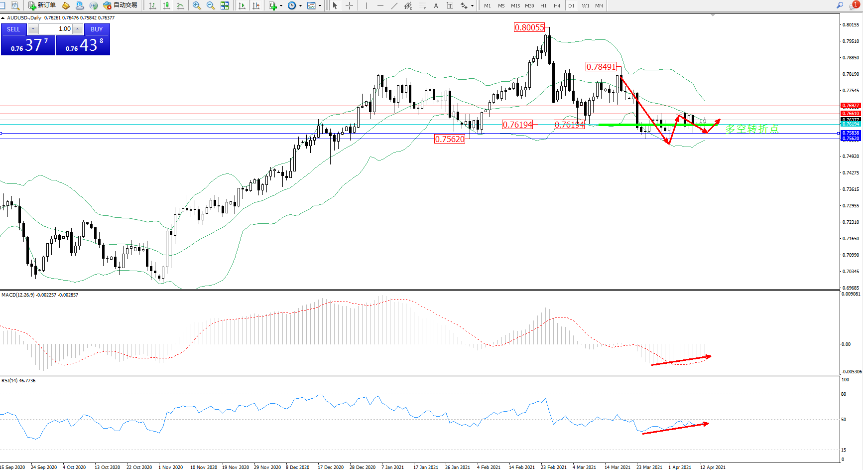 交易策略:0.76194上方看涨,目标0.76610、0.76927