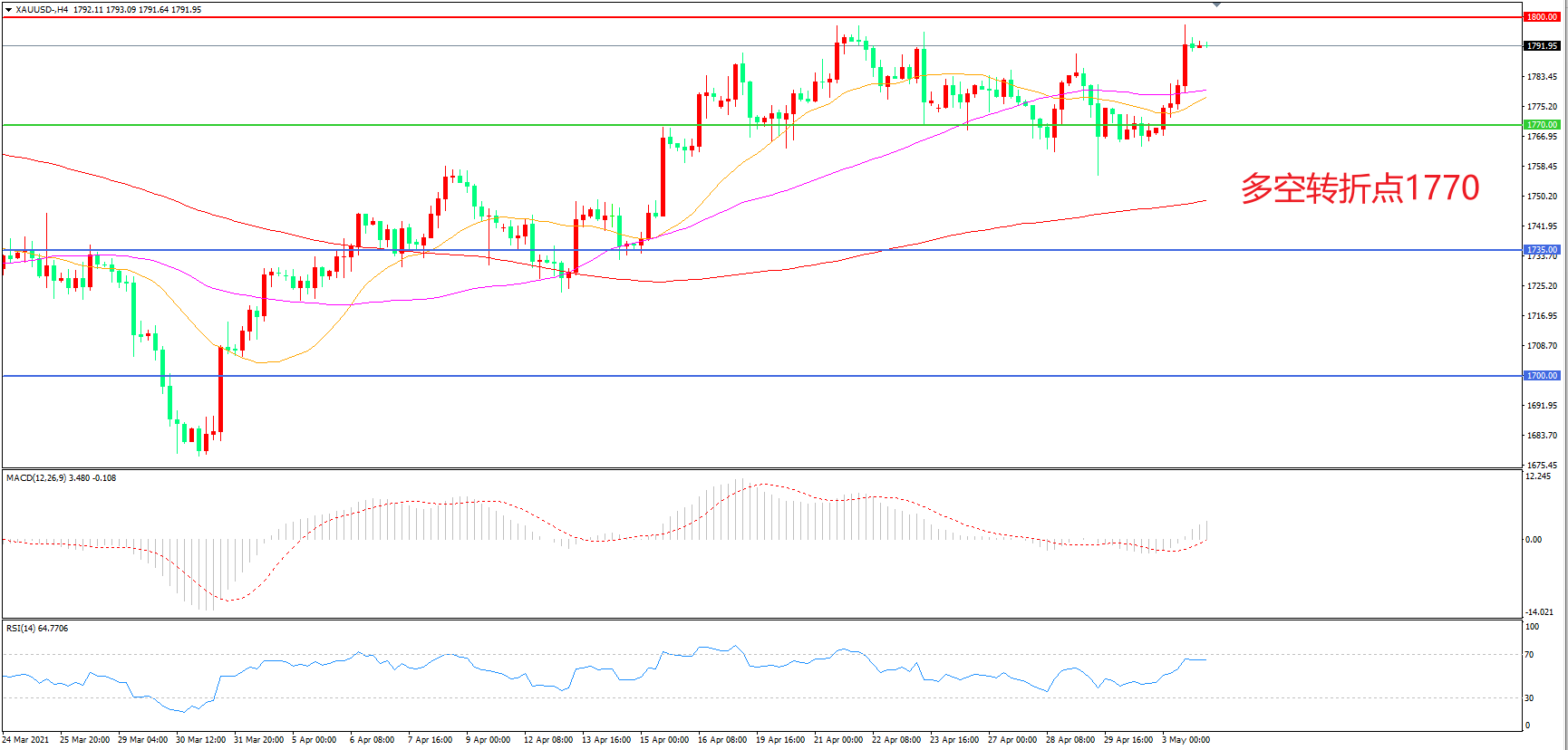 交易策略:在1770.00之上看涨,目标1800.00 1840.00