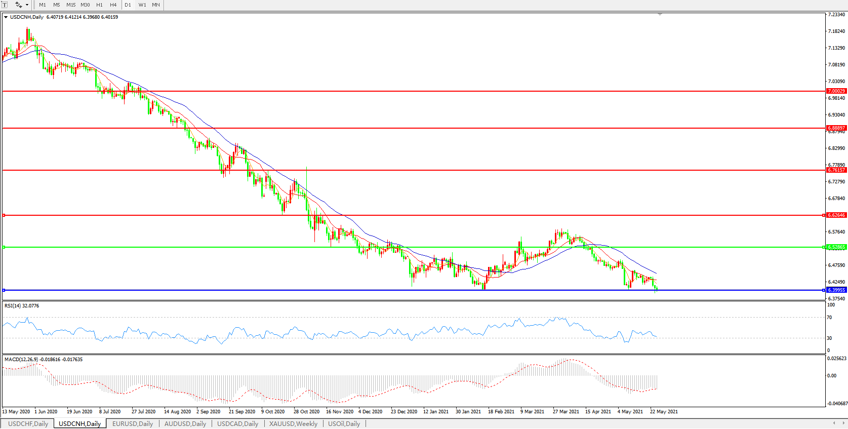美元兑人民币USDCNH 日线图: