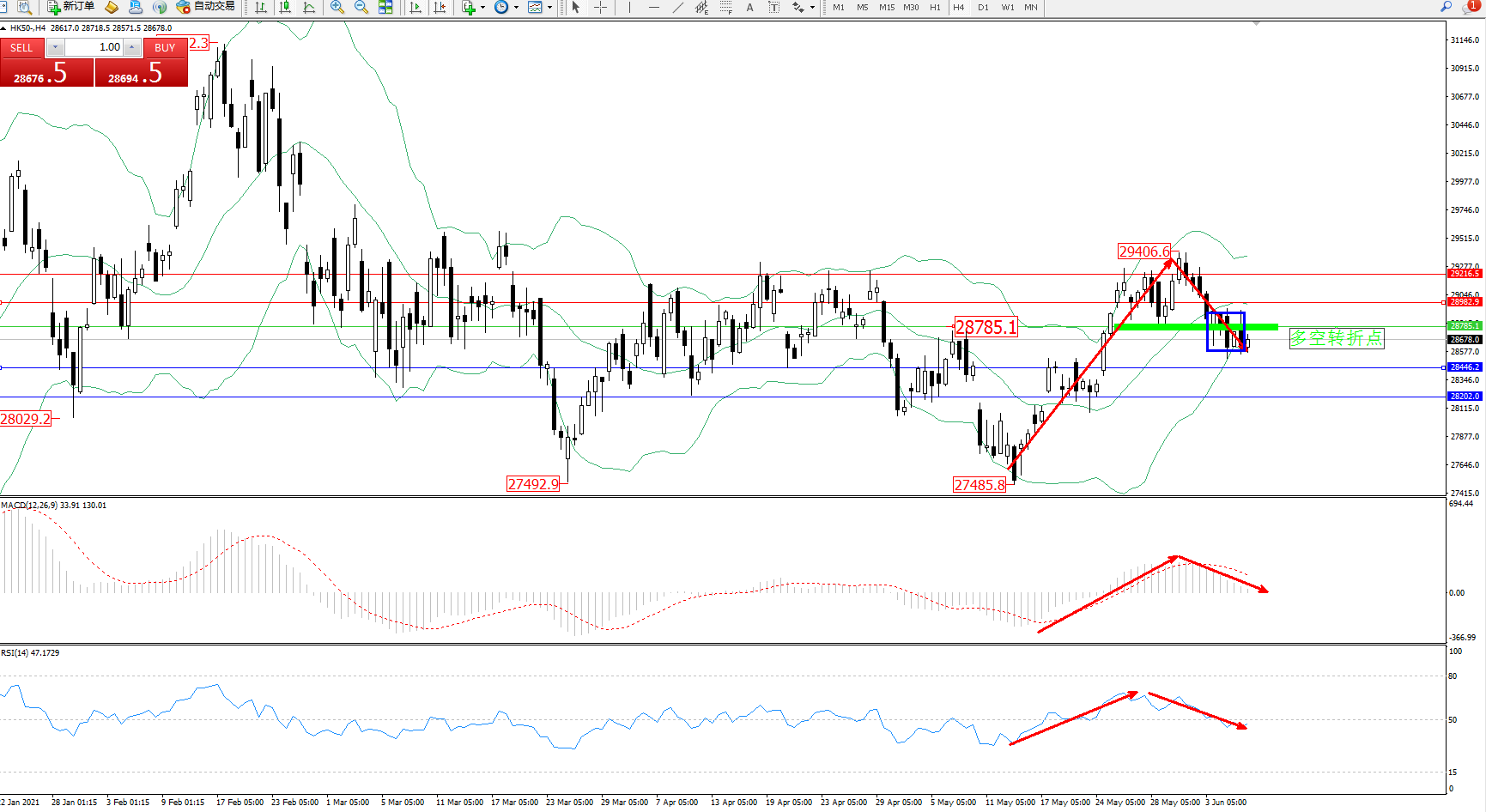 恒指HK50 ——4小时K线图显示: