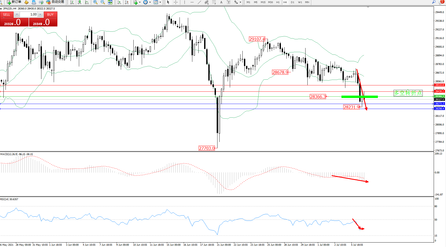 技术点评:空头动力延续布林带指标通道中下轨区间持续震荡下行,跌破下轨后抵达28231位置附近开始短暂震荡,空头动力有进一步向下移动态势,布林带指标呈张口走势持续中,MACD指标处于0轴线下方空头区域维持整理徘徊中,RSI指标处于50均衡线下方空头区域持续震荡后不断下挫整理;