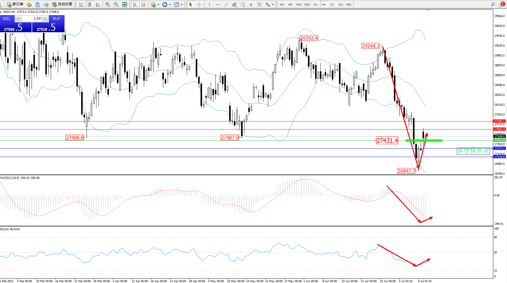 恒指HK50 ——4小时K线图显示: