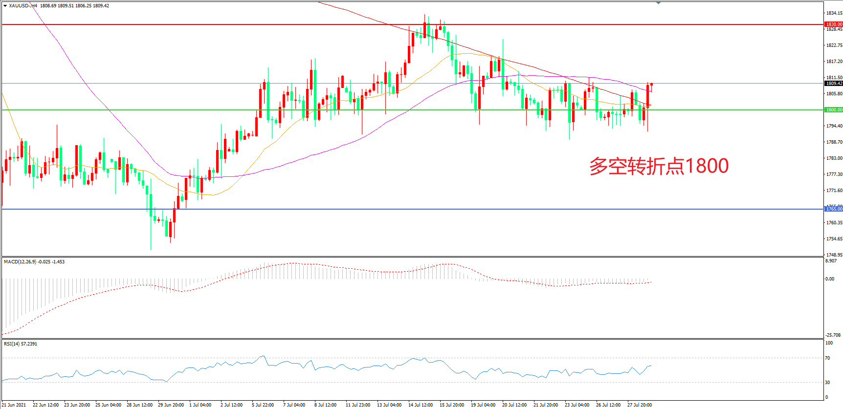 4小时图看,金价此前受制于均线压力震荡回落,但长下影的中阳反弹对行情形成明显提振,如能站稳1810一线,金价有望迎来一波上涨。