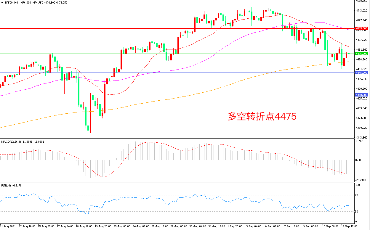 4小时图看,标普500先跌后涨,短期走势有所回暖,4445成为下方支撑,4475成为多空分水岭, MACD绿柱缩短,RSI指标走平,日内延续震荡概率较大。