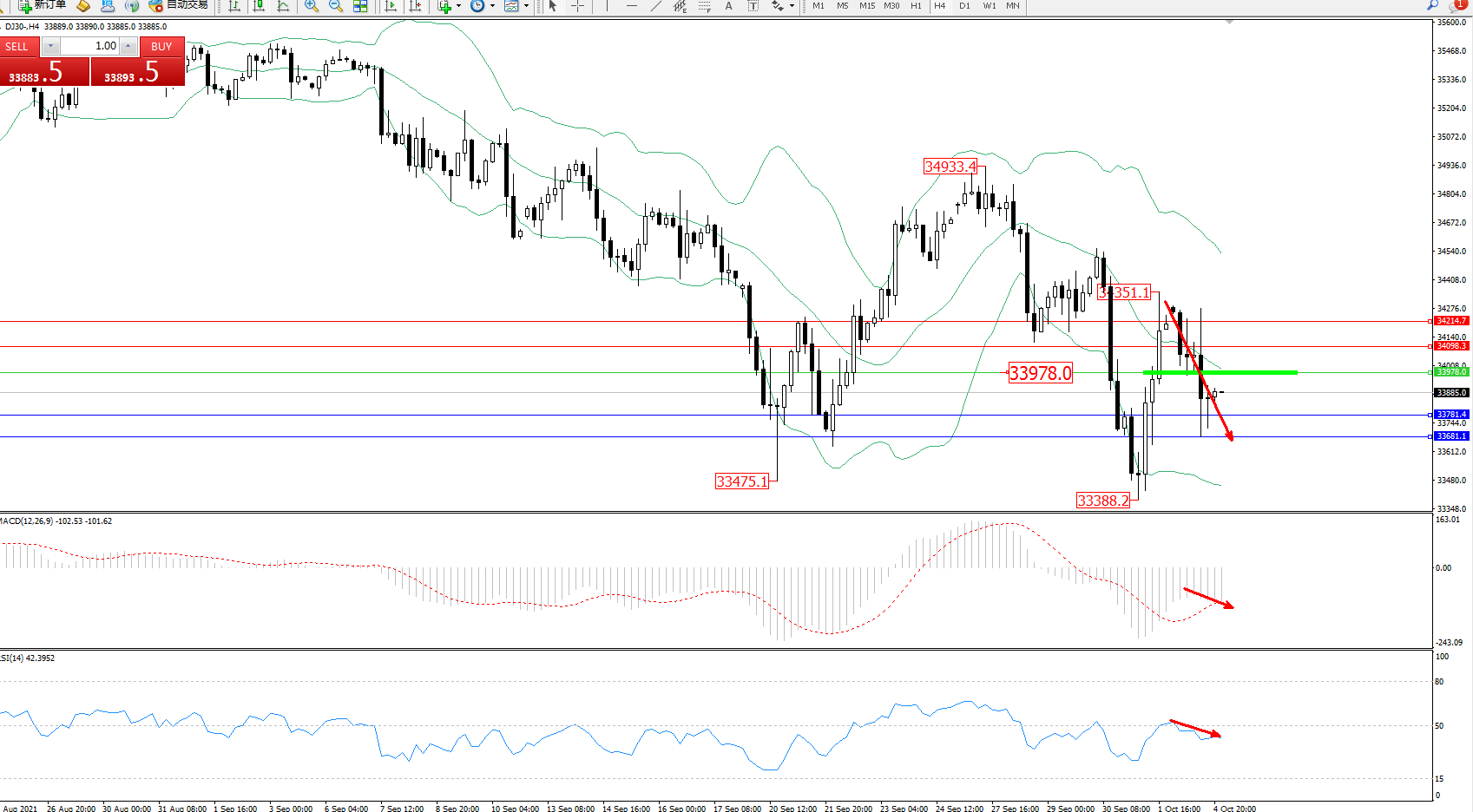 交易策略:33978下方看跌,目标33781、33681
