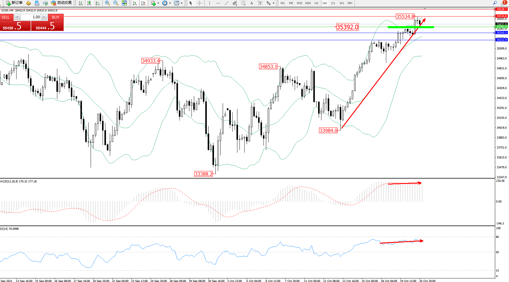 技术点评:多头动力延续布林带指标通道中上轨区间持续震荡上扬,高位抵达35534位置后短期遇阻整理,多头动力有继续攀升态势,布林带指标高位呈收口走势后开始有张口迹象,MACD指标处于多头区域高位维持整理平移,RSI指标处于多头区域维持整理徘徊中;