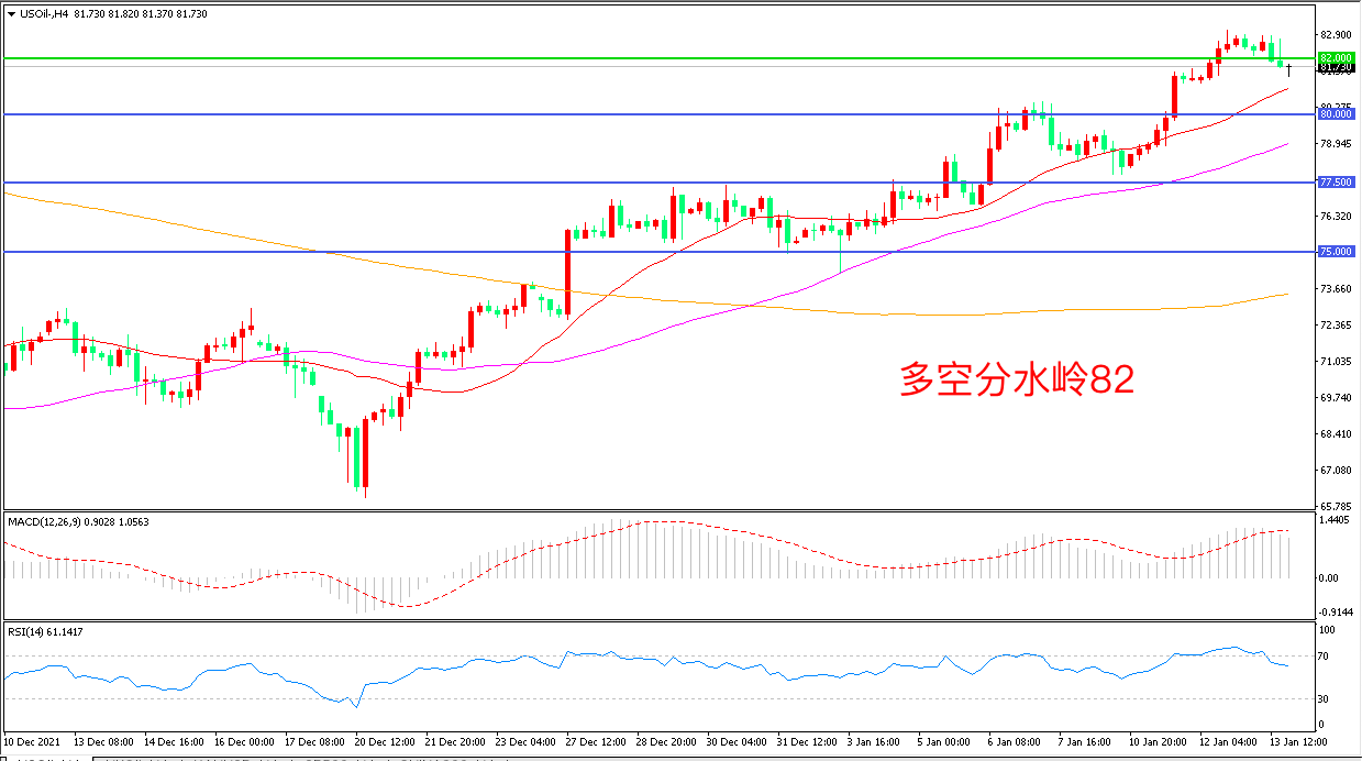 周四(1月13日),因全球奥密克戎变种病例激增,风险情绪回落,连续上涨的油价出现小幅回调,美国WTI原油小幅回落,收报81.74美元/桶。由于哈萨克斯坦抗议活动扰乱了铁路运行,哈萨克斯坦的石油日产量与1月4日相比下降了3.7%,随着冬季需求的回升,油价依然具备较强支撑。