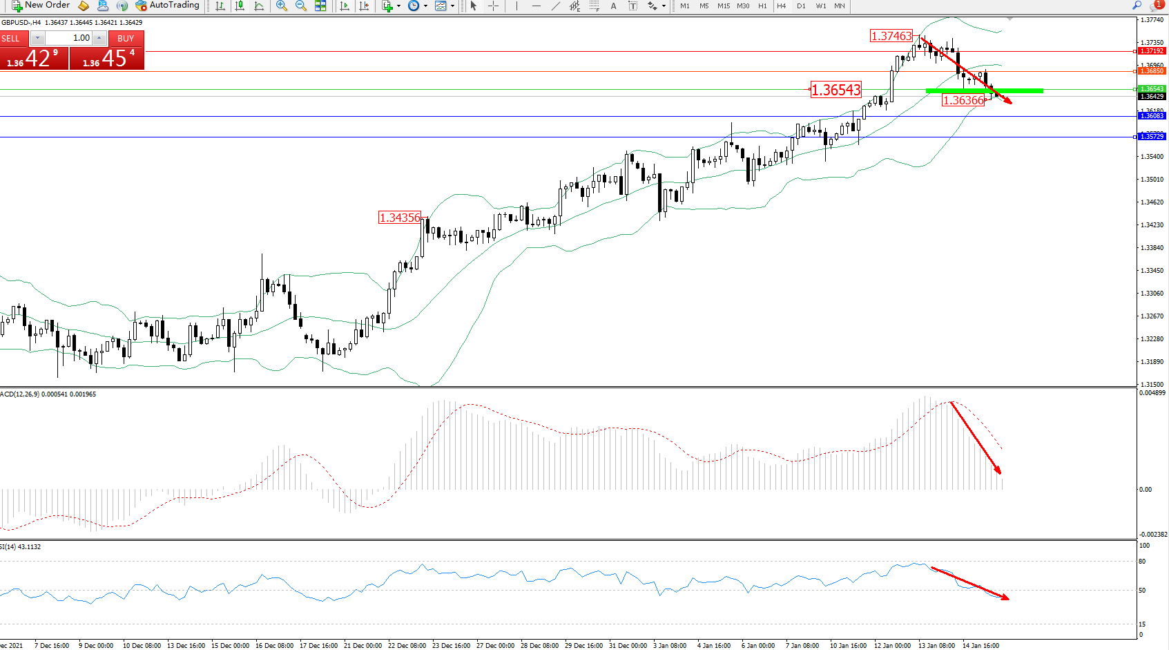 交易策略:1.36543下方看跌,目标1.36083、1.35729