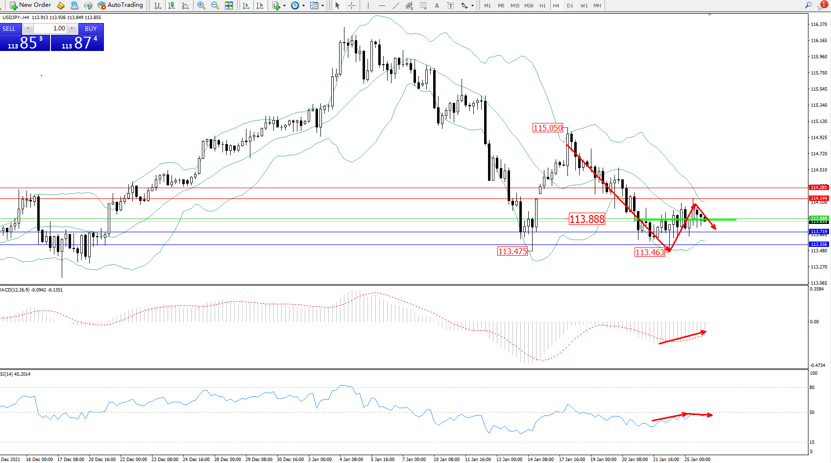 交易策略:113.888下方看跌,目标113.719、113.556