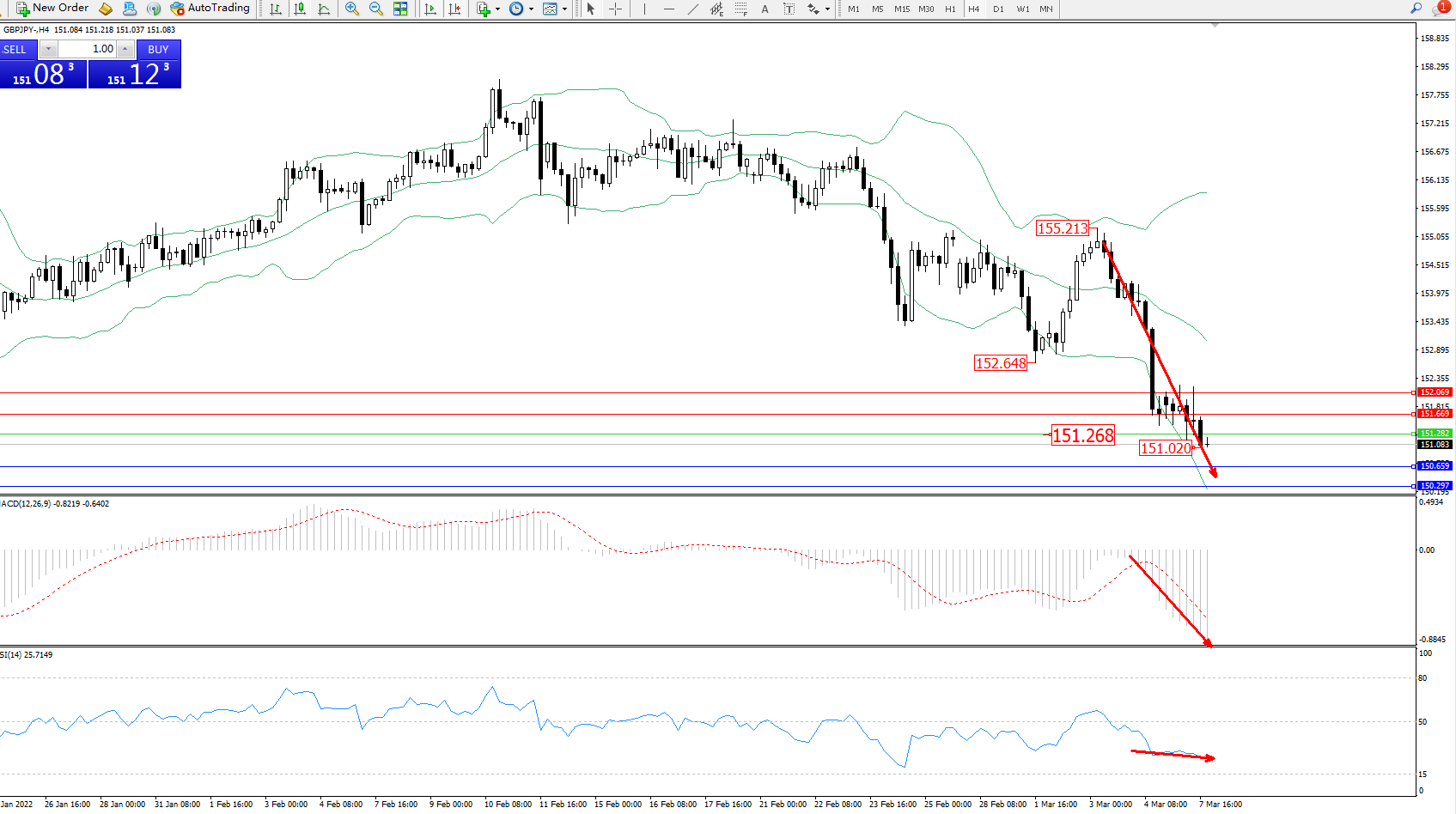 交易策略:151.268下方看跌,目标150.659、150.297