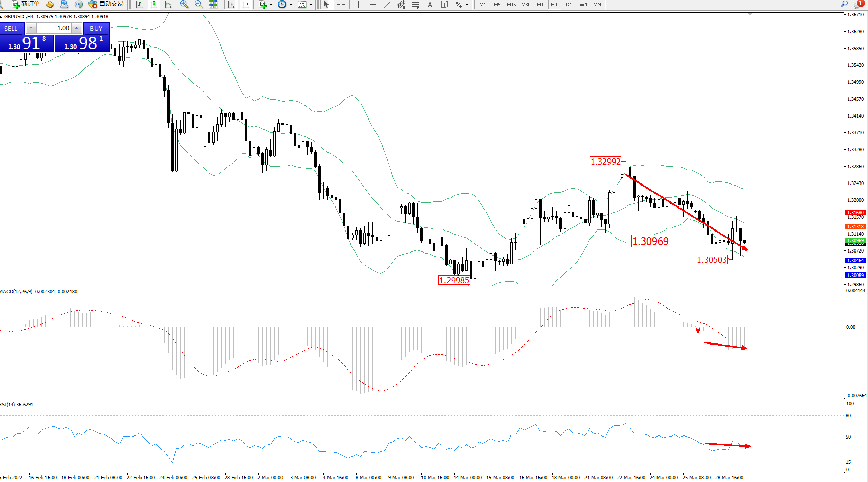 技术点评:空头动力延续布林带指标通道中下轨区间持续震荡下行,低位抵达1.30503位置节点后开始震荡,短期空头下行态势良好,布林带指标呈缓慢张口不断扩大下行中,MACD指标处于空头区域维持整理平移,RSI指标处50均衡线下方于空头区域维持弱势徘徊中;