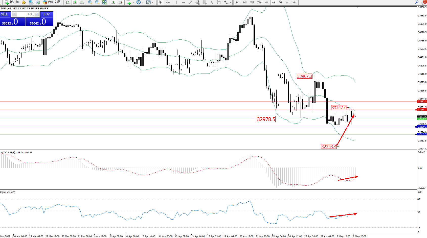 交易策略:32978上方看涨,目标33194、33382
