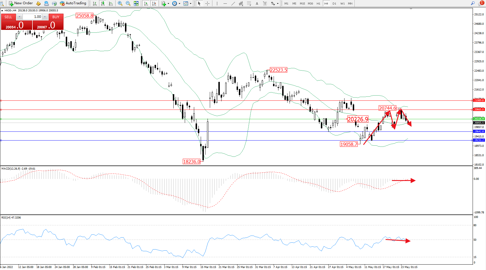 恒指HK50 ——4小时K线图显示: