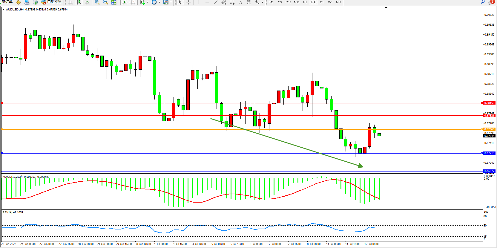 交易策略:0.67666下方看跌,目标0.67215、0.66877