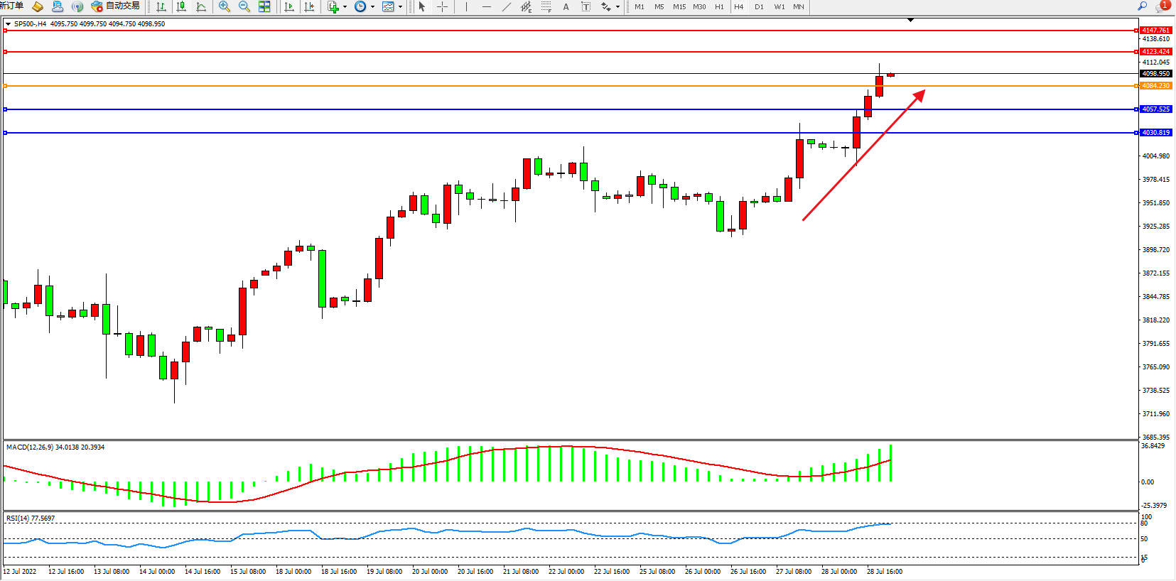 标普500指数7月28日(周四)收盘上涨48.54点,涨幅1.21%,报4072.15点;美国第二季度经济再次萎缩,助长了对美联储不会像之前预期的那样激进加息的猜测,美联储可能不需要像一些人担心的那样激进加息。