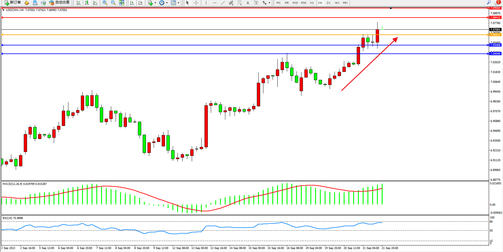 美元人民币USDCNH——4小时K线图显示: