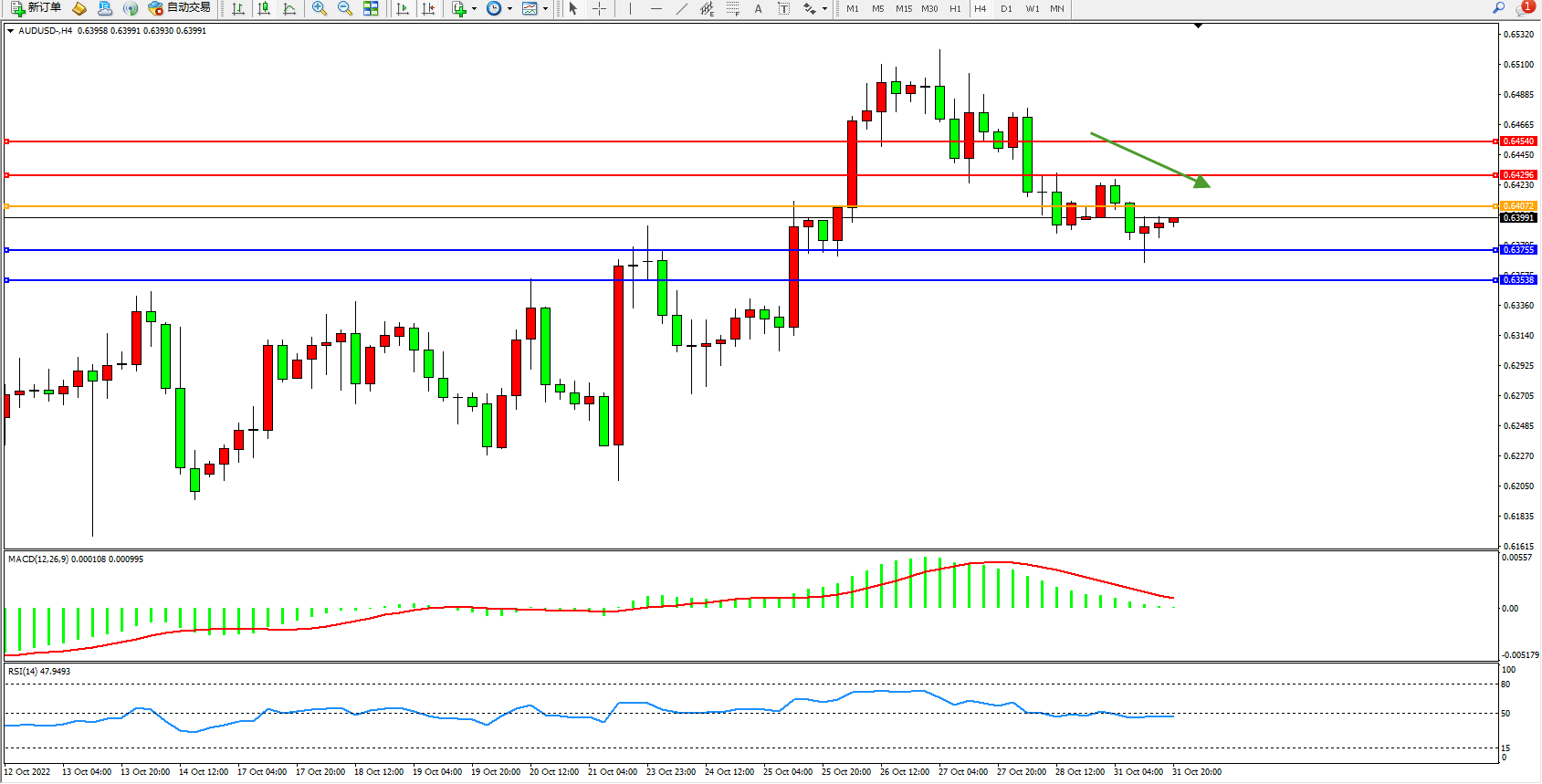 4小时图看:高位震荡回撤下行,短期空头动力有继续下移迹象,MACD指标空头动力维持震荡下行至0轴线附近徘徊,RSI指标处于50均衡线下侧整理;