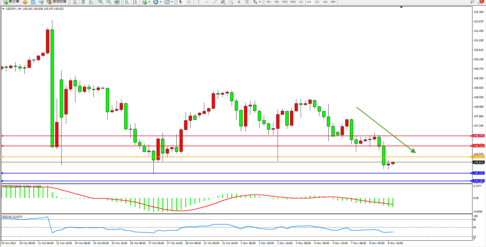 交易策略:145.853下方看跌,目标145.123、144.782