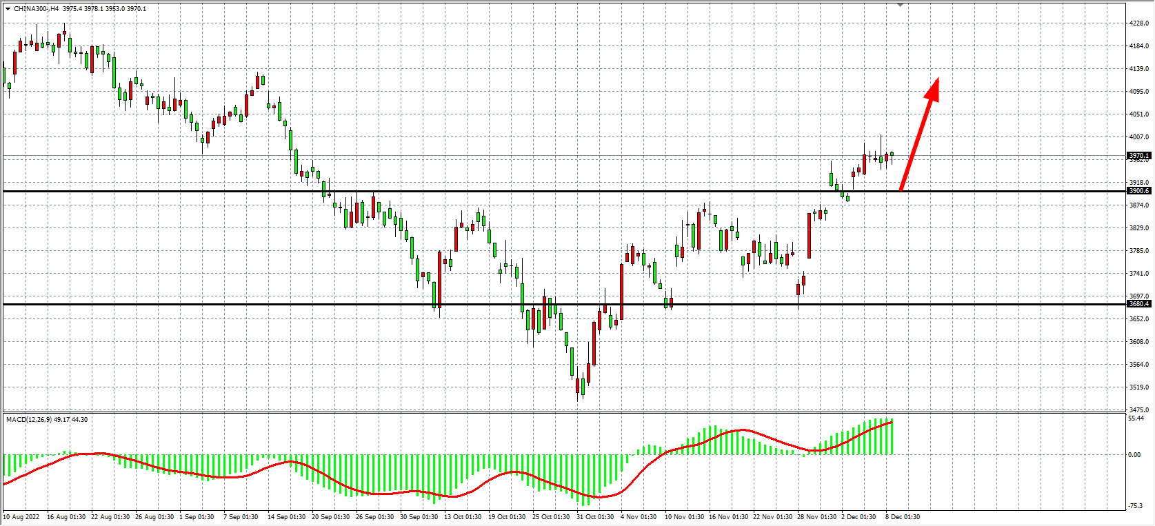 4小时图看,沪深3000在3900之上持续走强,一度触及4000点之上,MACD于零轴之上持续走高,显示行情有进一步扩大涨幅需求,当前支撑继续关注3900一线,在该位之上继续以看涨为主,上方目标4020-4080。